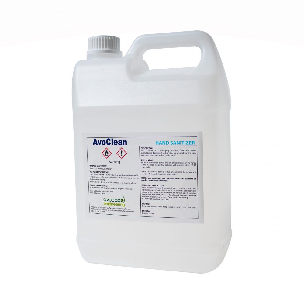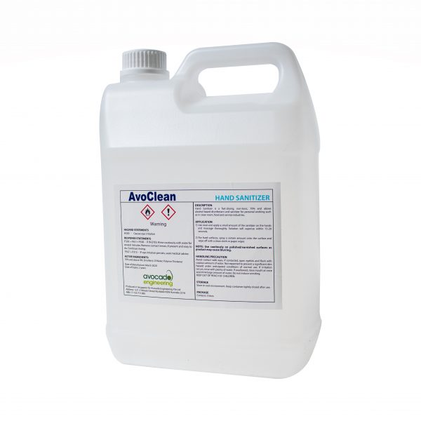 Avocado Engineering supplies AvoClean Alcohol-Based Hand Sanitiser Gel in 5 litre Economic refill packs. We are able to do contract production according to your requirements and with your specific brand needs. Our hand sanitiser (sanitizer) gel is based on a minimum 70% alcohol content, which is based on the recommendations of alcohol content of more than 70% for sanitiser products for a high efficiency against germs. AvoClean Hand Sanitiser Gel is the product of Avocado Engineering Pty. Ltd.